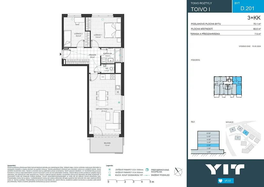 Byt 3+kk o celkové rozloze 70,1 m2 je situován v 2.NP projektu TOIVO Roztyly I. Cena zahrnuje bytovou jednotku, sklepní kóji a DPH.