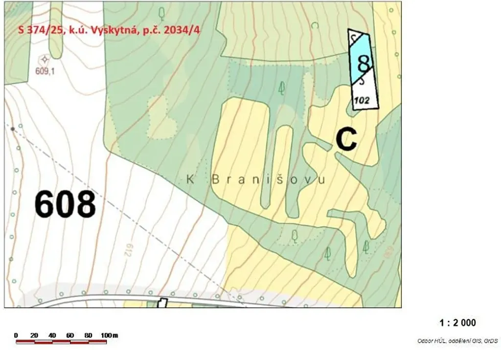 Jedná se o prodej lesního pozemku menší výměry, který je obklopený zemědělskými a lesními pozemky jiných vlastníků. Má výměru 2174 m2, na části pozemku se nachází listnatý porost (BR), na části je bezlesí zarostlé keři.