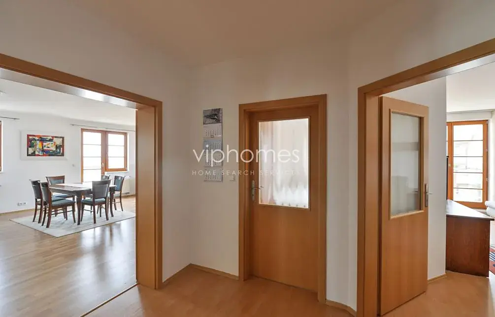Kompletně zařízený byt 3+kk (110 m2) v 6. patře v novém developerském projektu nedaleko pražského hradu. Šestipodlažní budova je umístěna na svažitém pozemku nad Bělohorskou třídou. Každá bytová jednotka má vlastní terasu o výměře 20 m2 s nádherným výhledem na Pražský hrad, nebo panorama Břevnova a Střešovic.