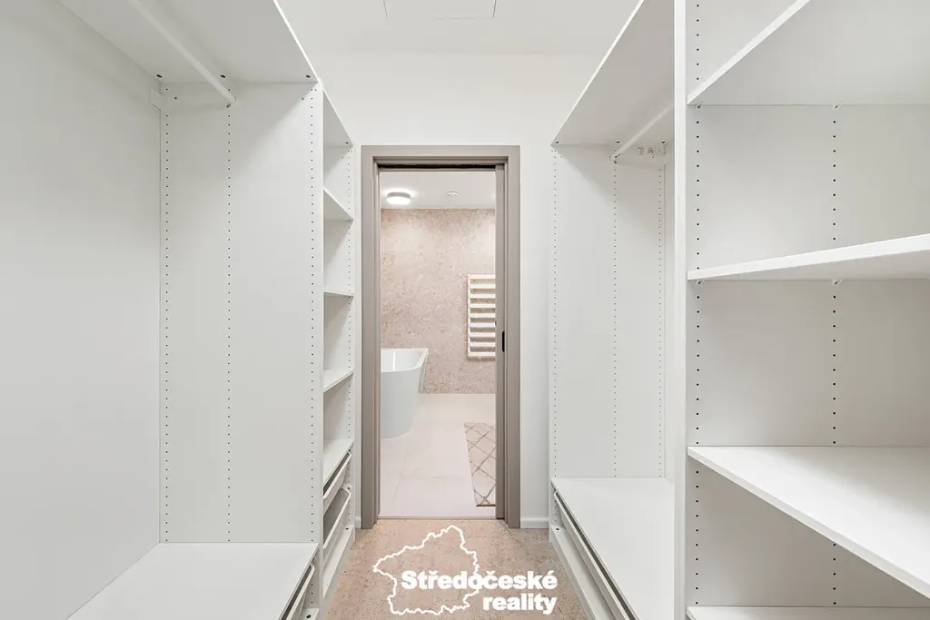 - hlavní ložnice s vlastní koupelnou (vana, sprcha, 2× umyvadlo) a šatnou (celkem 23 m²)