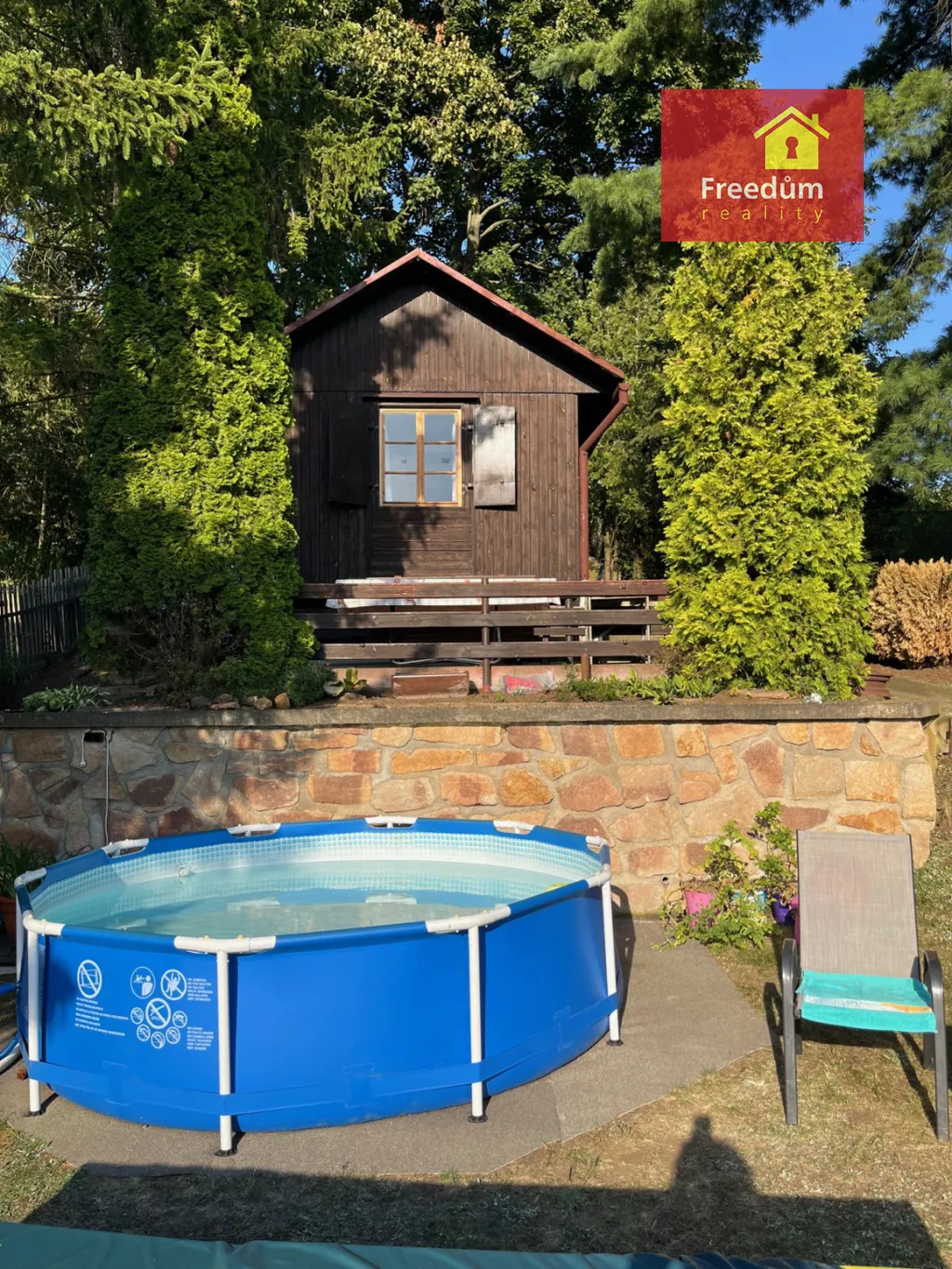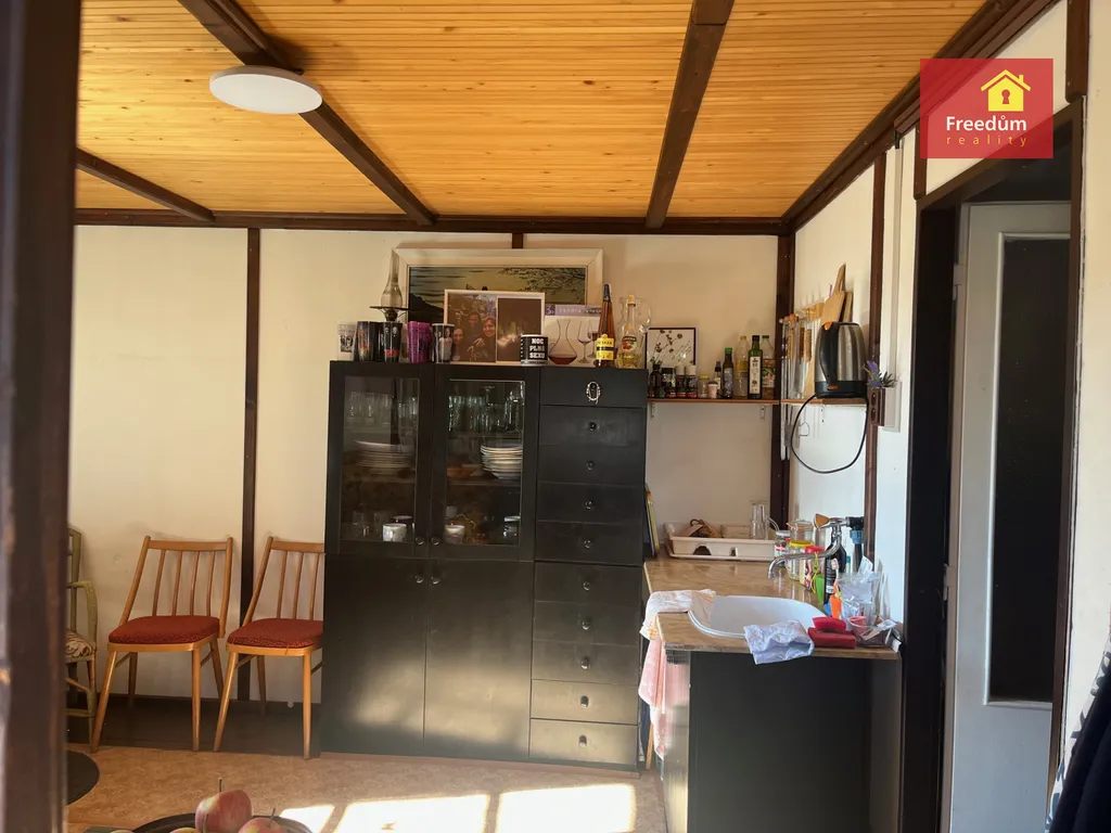 Dřevěná chatka o velikosti 22 m2 s úložným prostorem v podkroví. Zahráda je velká 648 m2.