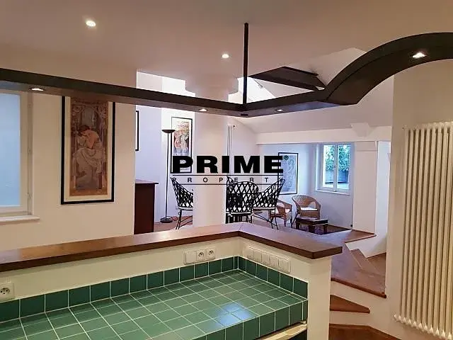 Elegantní, zrekonstruovaný, zařízený, 2 ložnicový, mezonetový byt se 2 koupelnami k pronájmu, 3+kk, 126m2, s balkonem 4m2, situovaný v 5. a 6. patře kompletně zrenovovaného novobarokního domu s výtahem. Budova se nachází v boční ulici u Karlova náměstí, na rozhraní Prahy 1 a Prahy 2, v blízkosti zastávky tramvaje, stanice metra Karlovo náměstí, obchodů, supermarketu Albert, kaváren, restaurací a pouze pár minut chůze k nákupnímu centru Quadrio i na nábřeží a 10 minut chůze na Václavské náměstí.