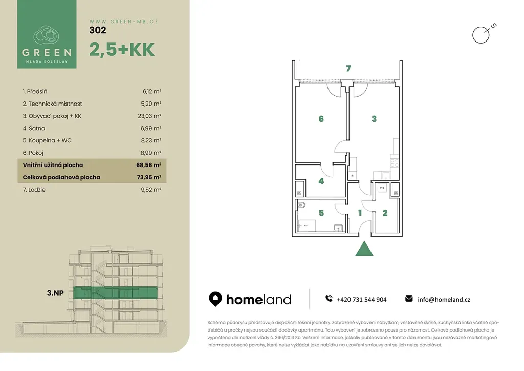 Světlý velkorysý byt s prostornou lodžií o podlahové ploše 73,95 m² je součástí moderního rezidenčního projektu Green Mladá Boleslav. Projekt vzniká v atraktivní části Mladé Boleslavi, v těsné blízkosti golfového hřiště a zeleně, přesto však s výborným spojením do centra města. Dokončení a k nastěhování již jaro/léto 2026. Dispozičně je byt rozdělen na prostorný obývací pokoj s přípravou na kuchyňskou linku, samostatnou ložnici, předsíň, koupelnu a praktickou komoru. Z obou pokojů je přímý vstup na západně orientovanou lodžii, která nabízí příjemný venkovní prostor k posezení či relaxaci.Díky vysokému standardu zpracování, podlahovému vytápění i chlazení a energetické třídě „A“ nabízí byt komfortní a zároveň úsporné bydlení. Objekt využívá moderní tepelná čerpadla, která přispívají k nízkým provozním nákladům.Součástí areálu je privátní komunitní zahrada vhodná k relaxaci či letnímu grilování, rozsáhlé parkovací možnosti včetně dobíjení elektromobilů a kompletní občanská vybavenost v pěší dostupnosti. Za příplatek garážové, nebo venkovní parkovací stání. Green Mladá Boleslav se nachází jen 5 minut jízdy od centra Mladé Boleslavi a zároveň poskytuje klidné prostředí obklopené přírodou. Projekt je situován v klidné části města s přímým napojením na zeleň a volnočasové aktivity. Bydlení v bezprostřední blízkosti golfových jamek osmnácti jamkového prestižního golfového hřiště přináší rezidentům široké možnosti pro trávení času s rodinou či přáteli. Pro více informací o jednotkách, cenách a dostupnosti kontaktujte naši kancelář, nebo navštivte oficiální webové stránky projektu GREEN-MB.
