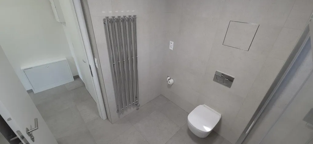 Koupelna je vybavena sprchovým koutem , toaletou, topným žebříkem a umyvadlem s koupelnovou skříňkou.