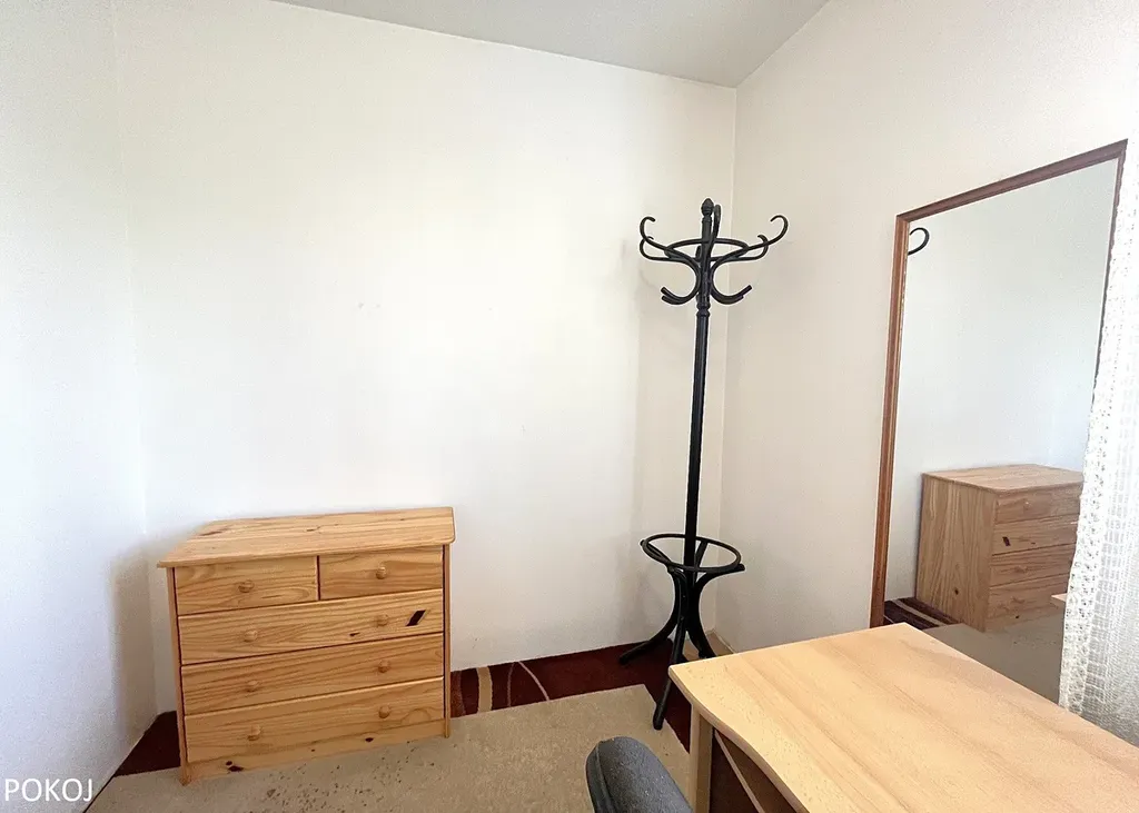 V pokoji je postel, psací stůl, komoda, zrcadlo, noční stolek a kancelářská židle.