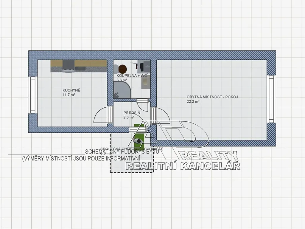 Dispozice: obytná místnost – pokoj [22.3m2], obytná kuchyně [11.8m2], předsíň [2.3m2], koupelna s WC [3.6m2].