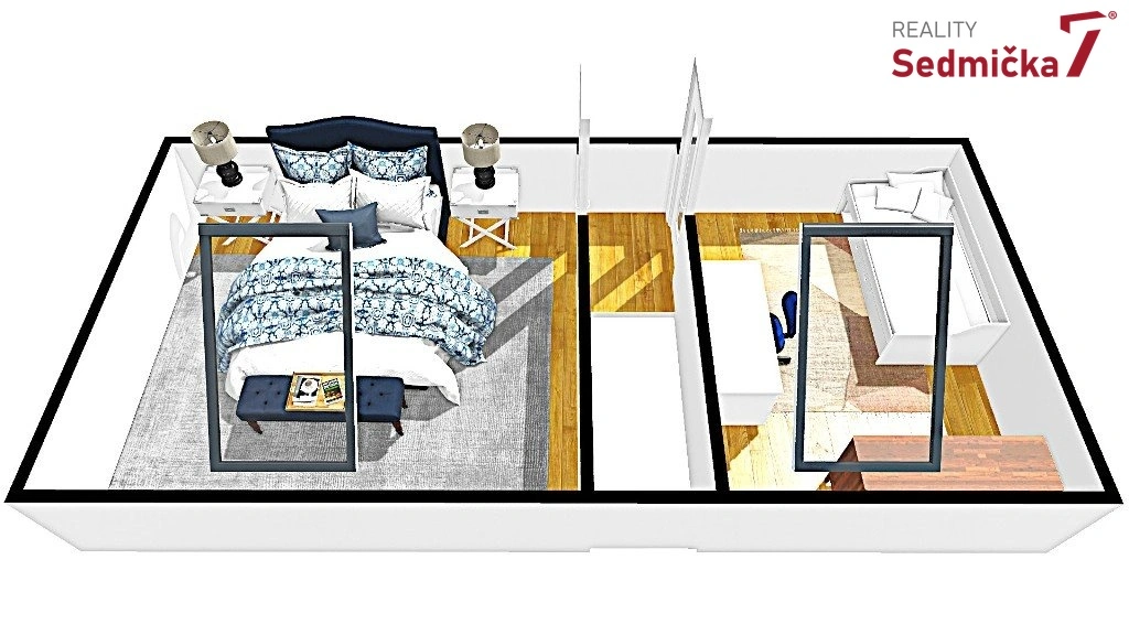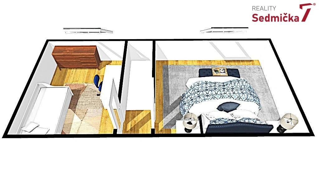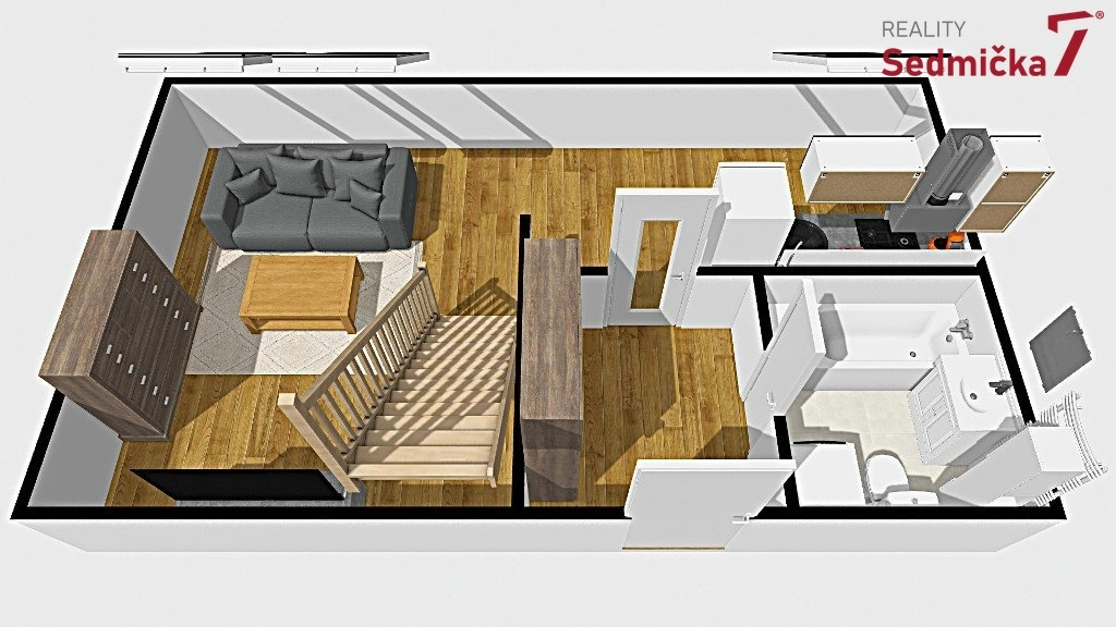 Ve spodním patře bytu je obývací pokoj s kuchyňským koutem, koupelnou s WC a chodbou. Z obývacího pokoje se po schodišti jde do druhého patra bytu se dvěma samostatnými pokoji. Z bytu je hezký výhled směrem na Vinohrady.