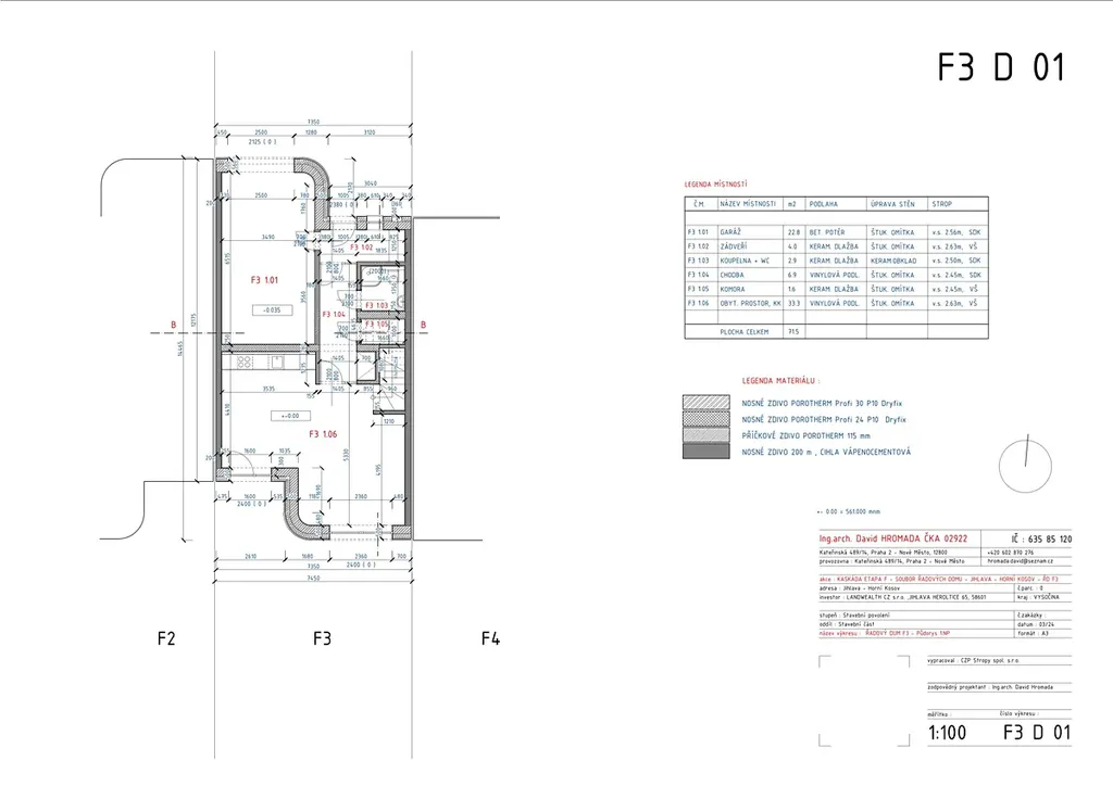 Nabízíme k prodeji rodinný dům „F3“. Jedná se o patrovou cihlovou stavbu s užitnou plochou 143 m² na pozemku o rozloze 303 m², která bude díky dispozici 4+kk ideálním domovem pro rodinu s dětmi i domácími mazlíčky. V přízemí, resp. 1.NP, se bude nacházet garáž, obývající pokoj s kuchyňským koutem, koupelna s WC, místnost na domácí práce a komora. V 2.NP budou tři pokoje s vlastní šatnou a koupelna s WC. Z obývacího pokoje bude výstup na zahradu.