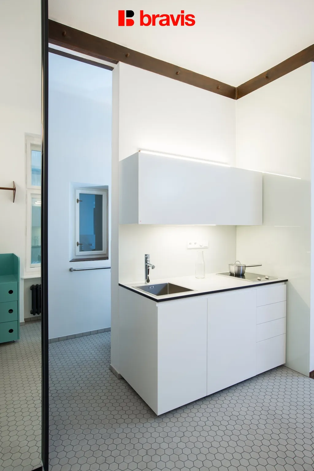 Kuchyňská část je vybavena kuchyňskou linkou vč. vestavných spotřebičů zn. Miele (indukční varná deska, trouba, lednice s mrazákem, pračka) a jídelním pultem se židlemi.