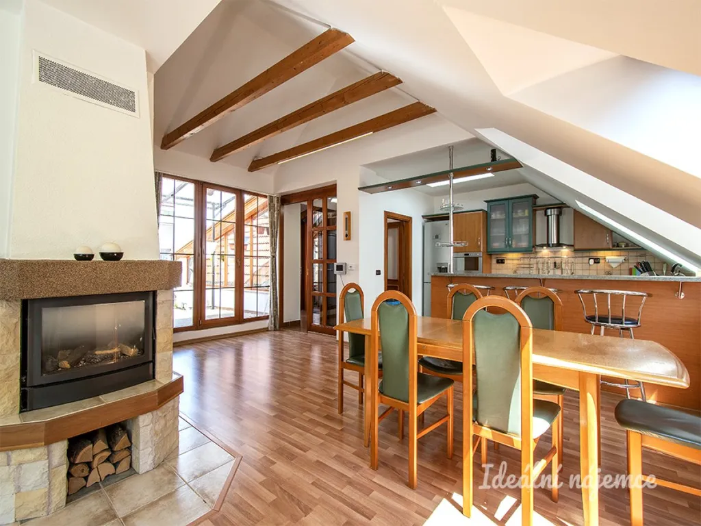 Byt se nabízí plně vybavený. Moderní kuchyně disponuje lednicí, myčkou, vestavěnou mikrovlnnou troubou, elektrickou troubou, varnou deskou a digestoří. V kuchyni je i barový stůl s židlemi. Skvěle prosvětlená obývací část je zařízena sedací soupravou, konferenčním stolkem, obývací komodou, jídelním stolem s židlemi, televizí a krbem. V první ložnici najdeme postel, komodu, šatní skříň a pracovní stůl s židlí. Součástí druhého pokoje je pracovní stůl s židlí, úložné komody a skříně. V poslední pokoji se nachází dvoupatrová postel a dětský nábytek. Nádherná koupelna je vybavena vanou, umyvadlem, pračkou a sušičkou. Toaleta je oddělená. Na chodbě najdeme také dostatek úložného prostoru.