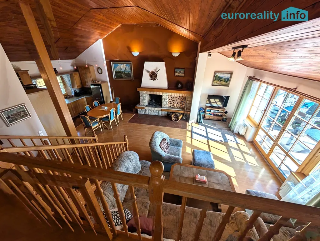 Tento patrový cihlový dům je vhodný jak k rekreaci, tak i k celoročnímu bydlení. Má dvě patra a mezipatro a pyšní se prostornou hlavní místností s krbem - obývacím pokojem, kuchyní a masivním dřevěným schodištěm s dřevěným obkladem.