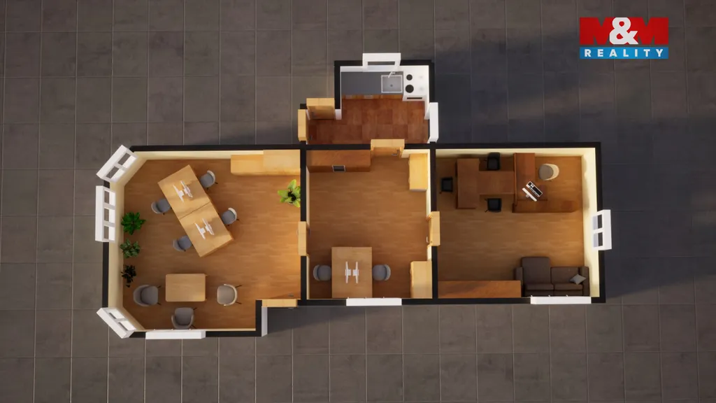 Dispozice zahrnuje tři samostatné místnosti, kompletní sociální zázemí včetně kuchyně a možnost variabilního uspořádání – kanceláře, zasedací místnost nebo klientská zóna. Prostory byly dlouhodobě využívány jako advokátní kancelář a jsou připraveny k okamžitému užívání bez nutnosti investic.