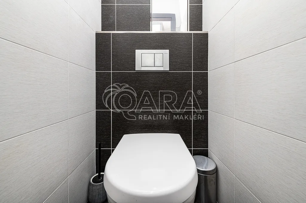 Koupelna prošla při kompletní rekonstrukci dechberoucí proměnou, která znamenala změnu dispozice i nadčasový design. Kombinace bílých velkoformátových obkladů, , elegantní baterie, obdelníkové bílé umyvadlo a zrcadlo. Zvětšený sprchový kout je opatřen skleněnými dveřmi a celodenní únavu můžete ze sebe smýt pod sprchou se systémem padajícího deště na přídavném sedátku. Toaleta je se systémem Geberit.