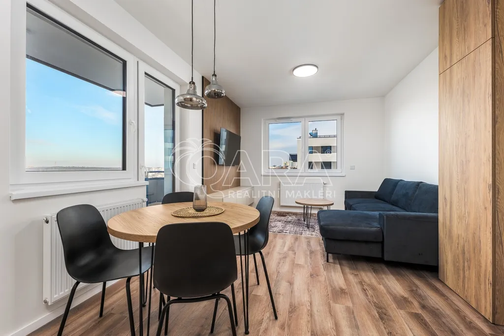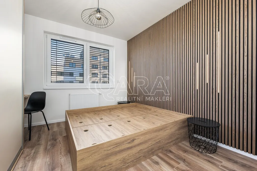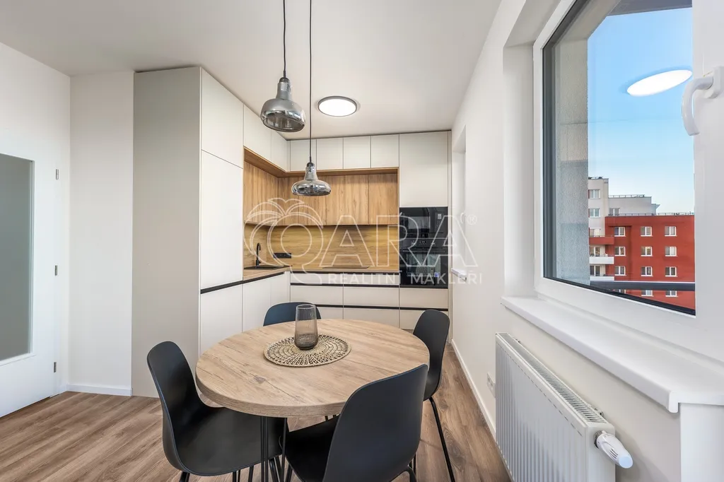 Nadstandardní byt disponuje podlahovou plochou 63 m2 plus lodžie a nachází se v 5. nadzemním podlaží nově dokončovaného projektu Výhledy Barrandov. Součástí vybavení je na míru zhotovená kuchyňská linka s vestavěnými kvalitními spotřebiči (indukční varná deska, mikrovlnná trouba a myčka, zabudovaná digestoř, lednice, mrazák). Koupelna s vanou, úložnými prostory a pračkou se sušičkou. Samostatná toaleta s umyvadlem. Komora, která nabízí další úložný prostor nebo ji lze využít jako šatnu. Dostatek úložného prostoru zabezpečují veškeré skříně, které jsou umístěny v předsíni, koupelně a ložnici. Součástí vybavení je také dvoulůžko v ložnici a další nábytek jako je nová sedací souprava, televize, jídelní stůl, židle. Druhá ložnice záměrně bez vybavení. Možno vybavit jako pracovnu, posilovnu či dětský pokoj. Obě ložnice mají výhled do klidného vnitrobloku. Obývací pokoj s lodžií je orientován do zeleně. K plnému využití máte k dispozici sklep, komoru v bytě a ještě jednu komoru v budově. O úložné prostory je tak náležitě postaráno. K bytu náleží garážové parkovací stání. V domě je k dispozici také kočárkárna / kolárna.