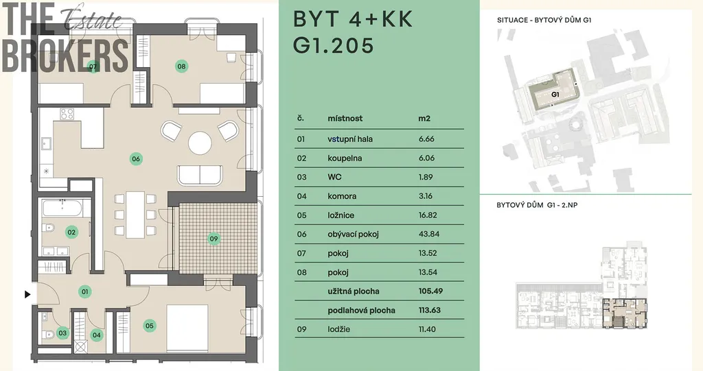 Tento prosvětlený jihozápadně orientovaný byt se nachází ve druhém nadzemním podlaží, disponuje užitnou plochou 105,5 a podlahovou plochou 113 m² plus lodžie 11,4 m², což nabízí příjemné a komfortní bydlení a poskytuje možnost relaxace a trávení volného času venku. Oceníte také možnost dokoupení sklepa a garážového parkovacího stání. Standardní výbavou všech jednotek jsou vytápěné podlahy, elektrické před-okenní žaluzie, možnost využití venkovní elektro nabíjecí stanice pro automobily a společná komunitní zahrada. Možnost využití instalace smart ovládání bytu na dálku v rámci klientských změn.