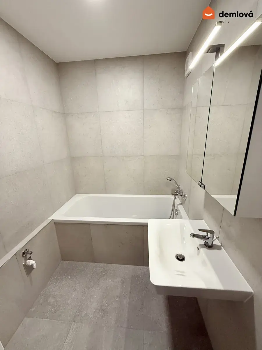 Kuchyňská linka ve vysokém provedení a moderním designu je vybavena spotřebiči, včetně myčky, multifunkční trouby, digestoře a pl. sporáku. Koupelna je vybavena designovými velkoformátovými obklady, vanou, umyvadlem a zrcadlovou skříňkou. Závěsná toaleta je samostatně. Interiérové dveře včetně zárubní a kvalitní vinylové podlahy. Velká vstupní chodba a neprůchozí pokoje nabízejí dostatek prostoru. Z bytu je příjemný výhled na dvě světové strany. Z obývacího pokoje je vstup na lodžii, které vede přes celý pokoj a nabízí místo k relaxaci.