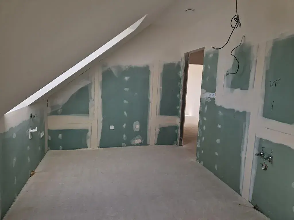 finální povrch podlah (nyní broušený anhydrid), obklady, sanita (vana, umyvadlo, WC), parapety, zárubně, interiérové dveře.