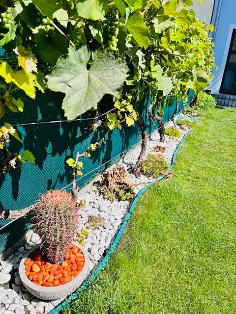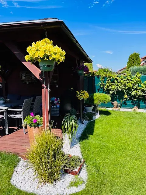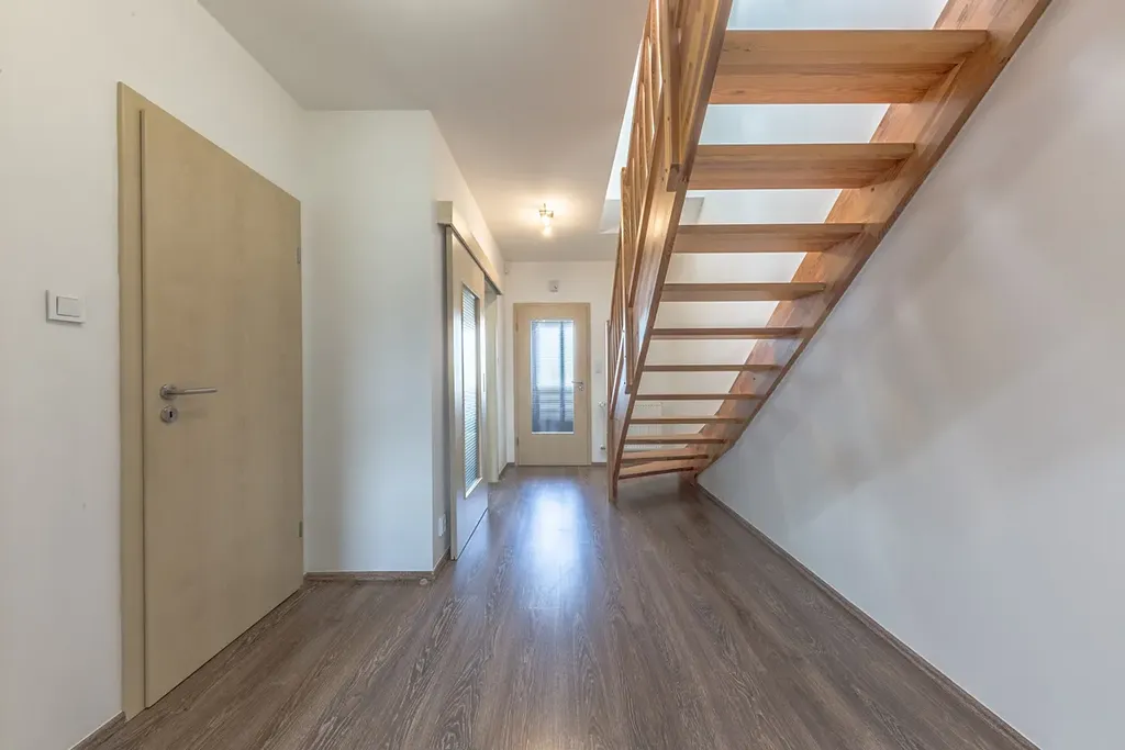 Do bytu se jde po schodech, které ústí na balkoně a odtud je vstup do bytu. Stejně je na druhé straně domu vyřešen vstup na zahradu. Zde je instalovaná markýza, která v případě potřeby příjemně stíní. Zahrada je přístupná také z ulice malou brankou.