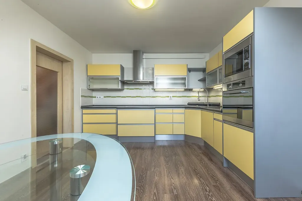 Kuchyně je vybavena vestavěnými spotřebiči a je zde i příprava na americkou lednici.