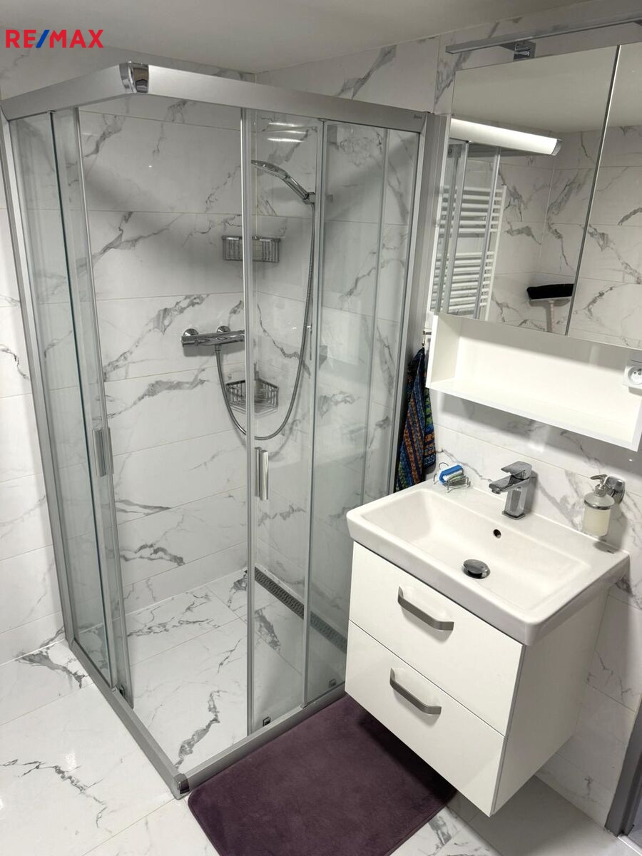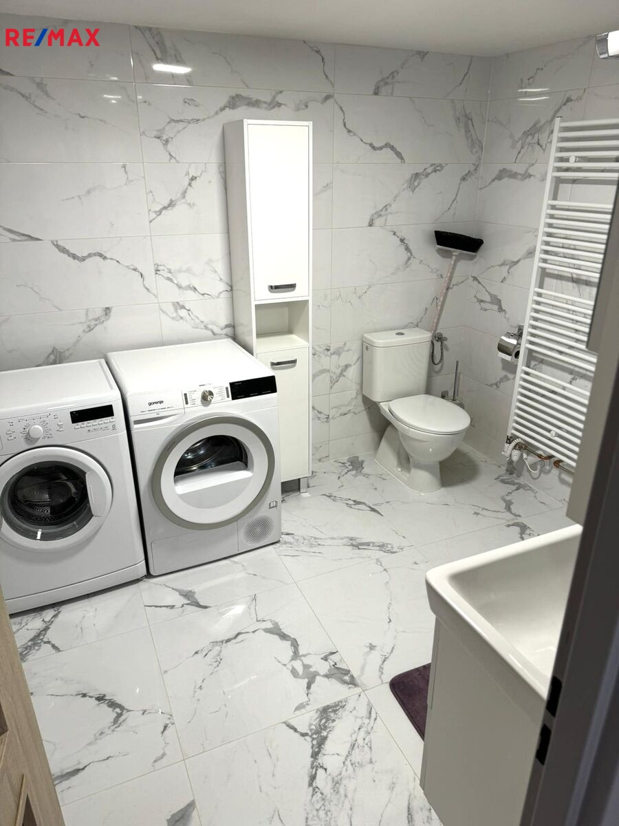 koupelna se sprchovým koutem, pračkou a sušičkou