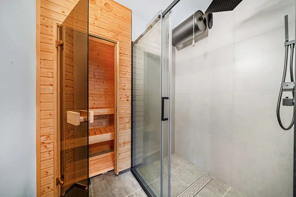 Přízemí: kuchyně, obývací pokoj, koupelna se sprchou a WC, chodba, sauna s relaxační místností a sprchou