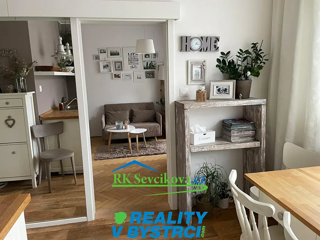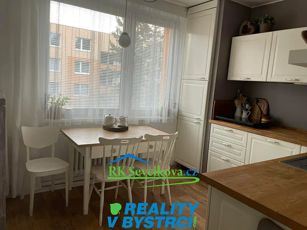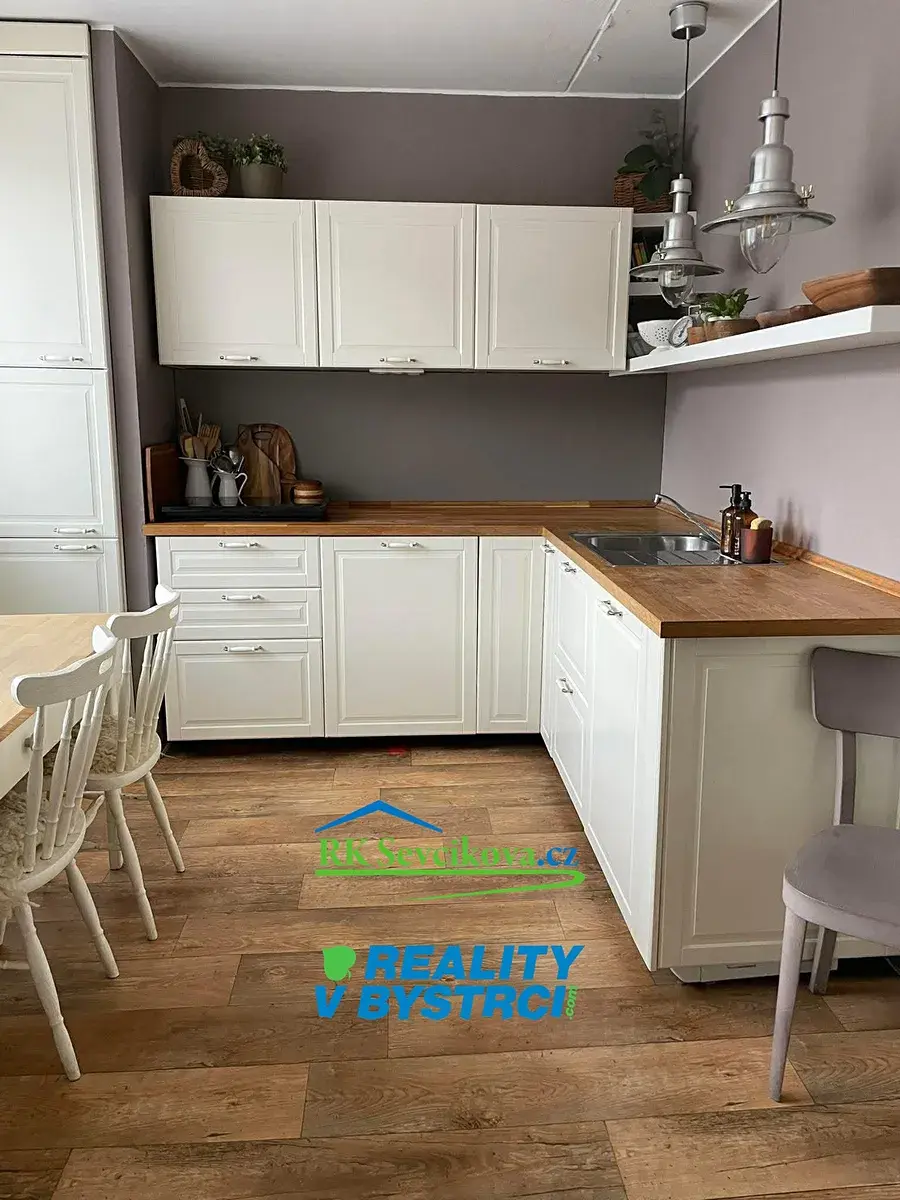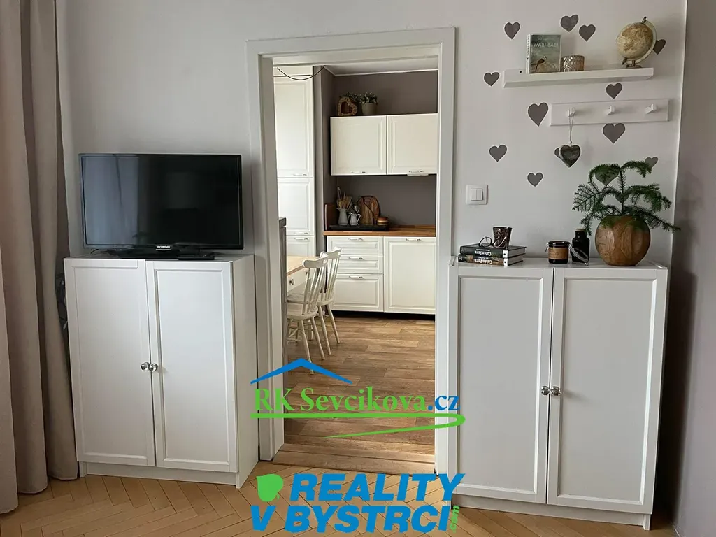 Byt je vybaven moderní kuchyňskou linkou se zabudovanou myčkou nádobí, pračkou, indukční varnou deskou a jídelním stolem se židlemi. Lednice a trouba jsou prakticky umístěny ve spíži. V obývacím pokoji o velikosti 16 m² zůstávají komoda, skříně, manželská postel s úložným prostorem.
