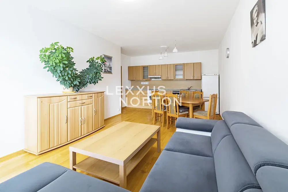 Byt je kompletně zařízený a připravený k nastěhování. K dispozici je koupelna s vanou a pračkou, kuchyňský kout je vybavený myčkou nádobí, troubou, sporákem, lednicí a mrazákem. Součástí obývací části je jídelní souprava, pohovka, konferenční stolek a komoda. V ložnici se nachází postel, šatní skříň, komoda a televizor.