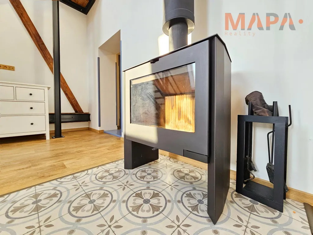 Byt se nachází v klidném rodinném domě v zavedené městské zástavbě a nabízí originální dispoziční řešení, které kombinuje moderní komfort s přírodními prvky. Dominantou interiéru jsou pohledové dřevěné trámy, otevřený prostor a krbová kamna, která vytvářejí výjimečně útulnou atmosféru.