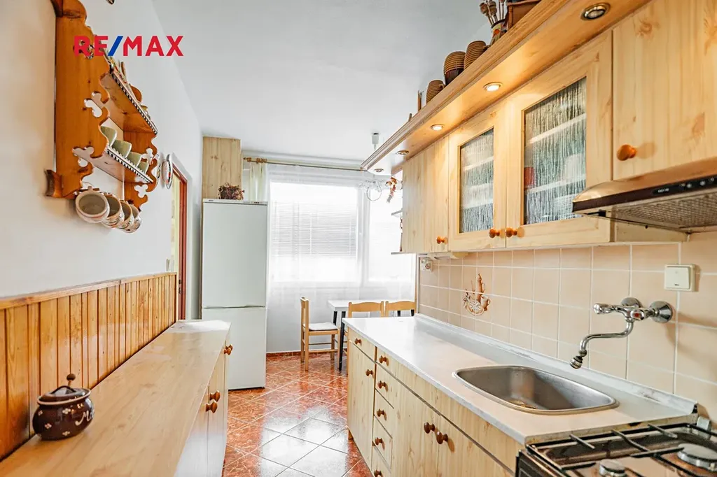 Byt se nachází v osmém patře revitalizovaného panelového domu s výtahem. Při vstupu do bytu se nacházíme ve větší předsíni (zádveří). Naproti nám je toaleta oddělená od koupelny (jádro bytu je původní). V předsíni se dále nachází vestavěná komora. Z předsíně se můžeme vydat buď do kuchyně s jídelnou, naproti které se nachází samostatný pokoj, nebo do obývacího pokoje a odtud dál do dalších dvou ložnic. Jedna disponuje lodžií. K bytu náleží ještě sklepní kóje. Byt je orientovaný na jihovýchodní stranu.