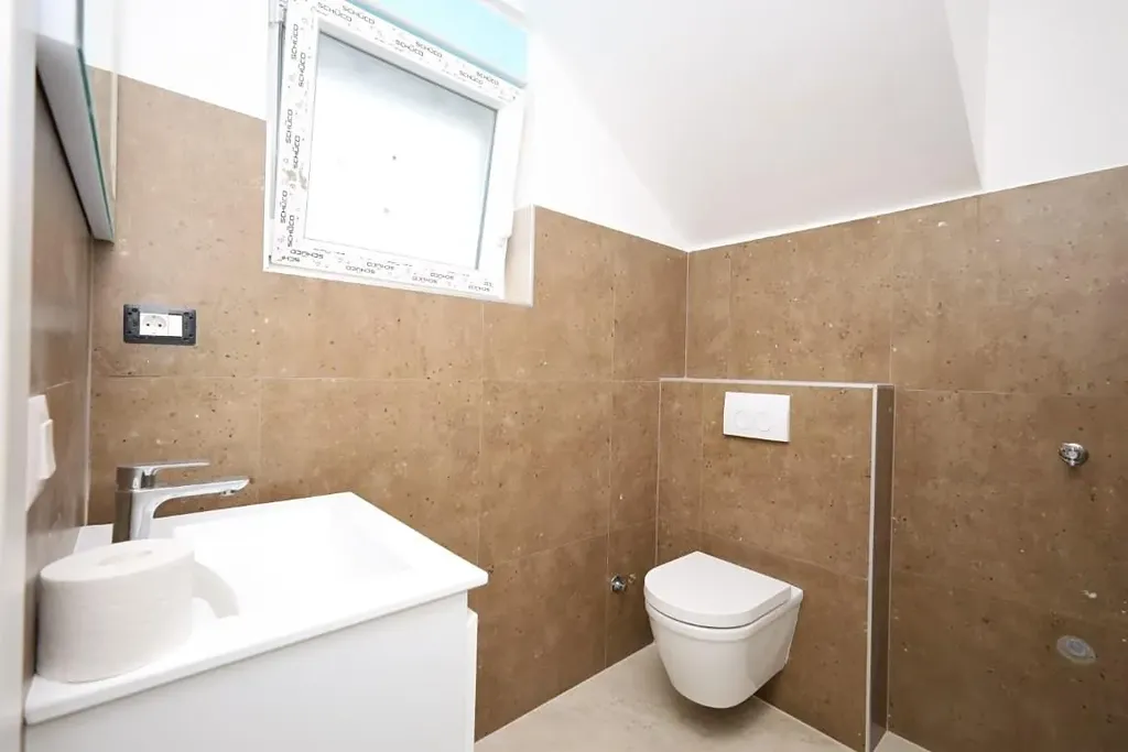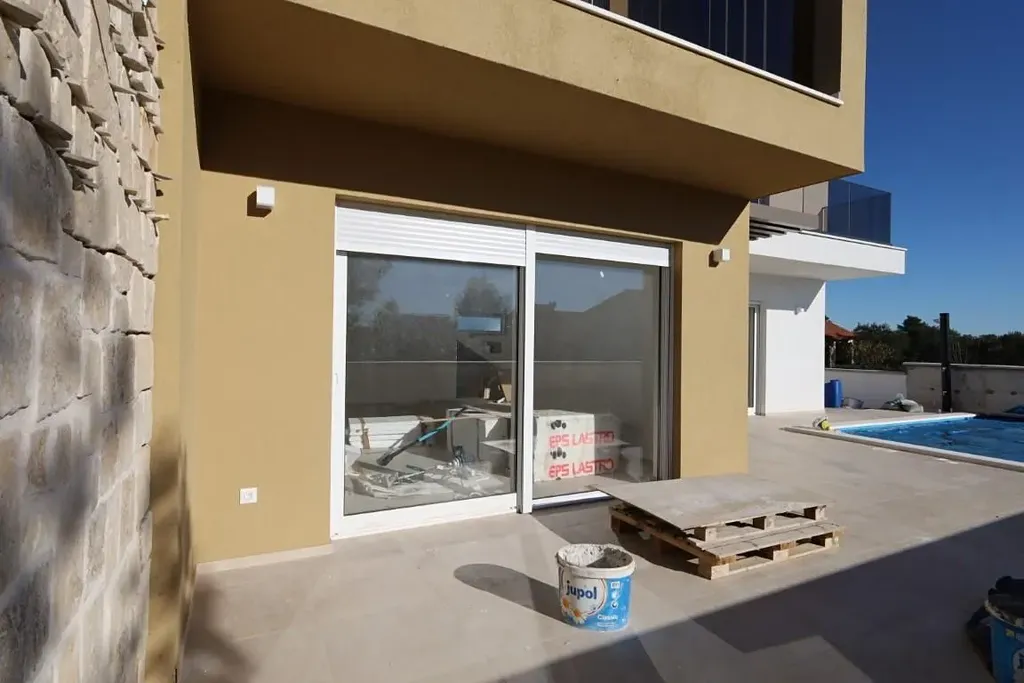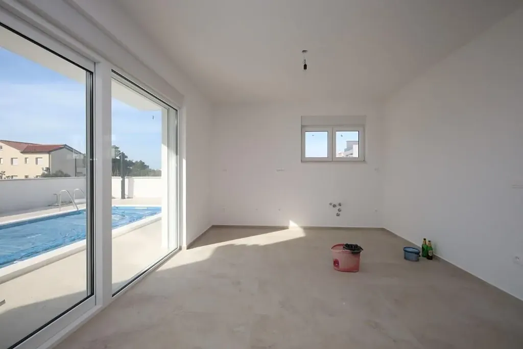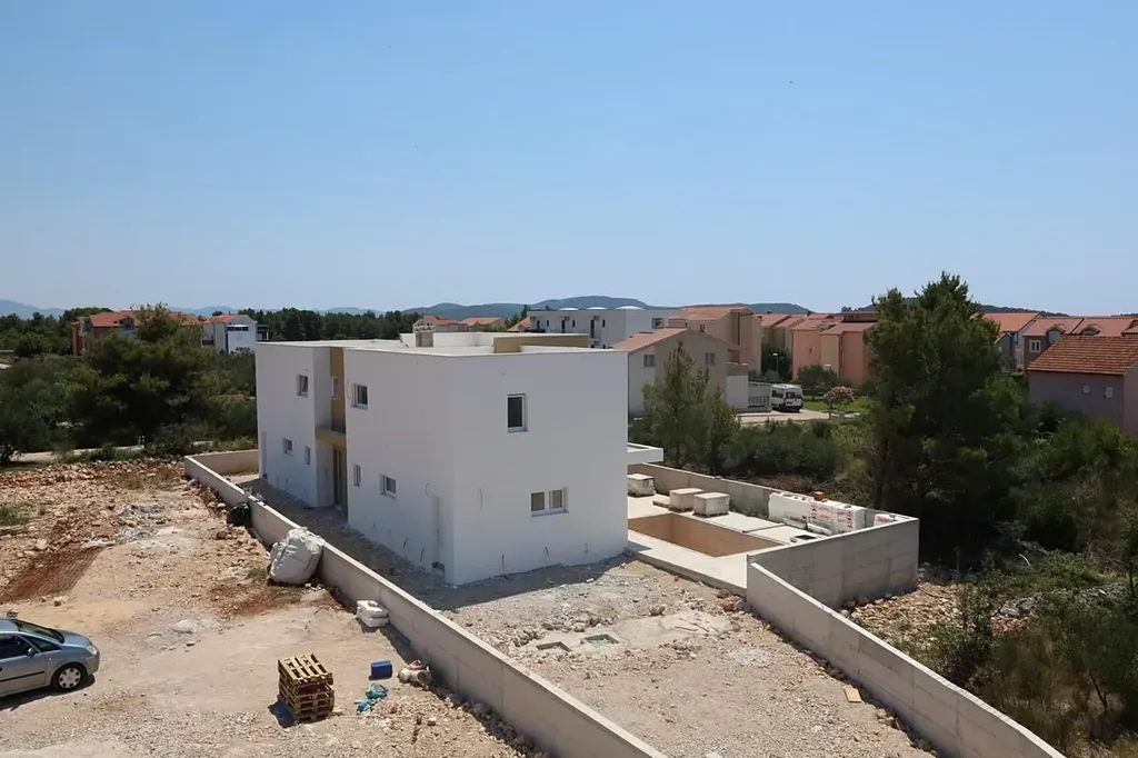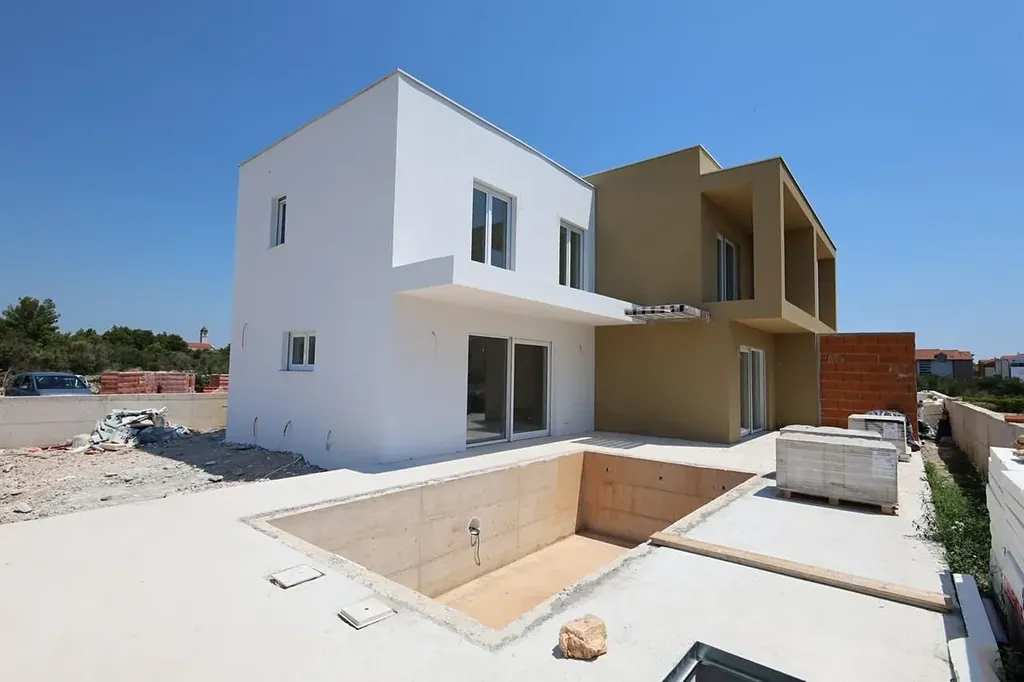 Dovolujeme si Vám nabídnout nový řadový atraktivní dům s bazénem v obci Srima v Šibenické oblasti v Chorvatsku. Dvoupodlažní dům o ploše 144,65 m2 stojí na pozemku o rozloze 119,61 m2 a tvoří polovinu dvojdomku. Plánovaný termín dokončení výstavby připadá na konec roku 2023.