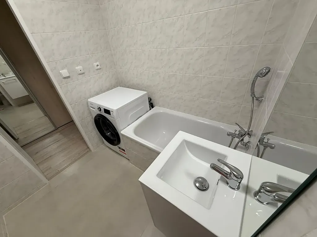 Dispozice bytu zahrnuje plně vybavenou kuchyň se spotřebiči, koupelnu s pračkou a vestavěné skříně v předsíni, které poskytují dostatek úložného prostoru. Díky umístění ve vyšším patře je byt velmi světlý a působí vzdušně.