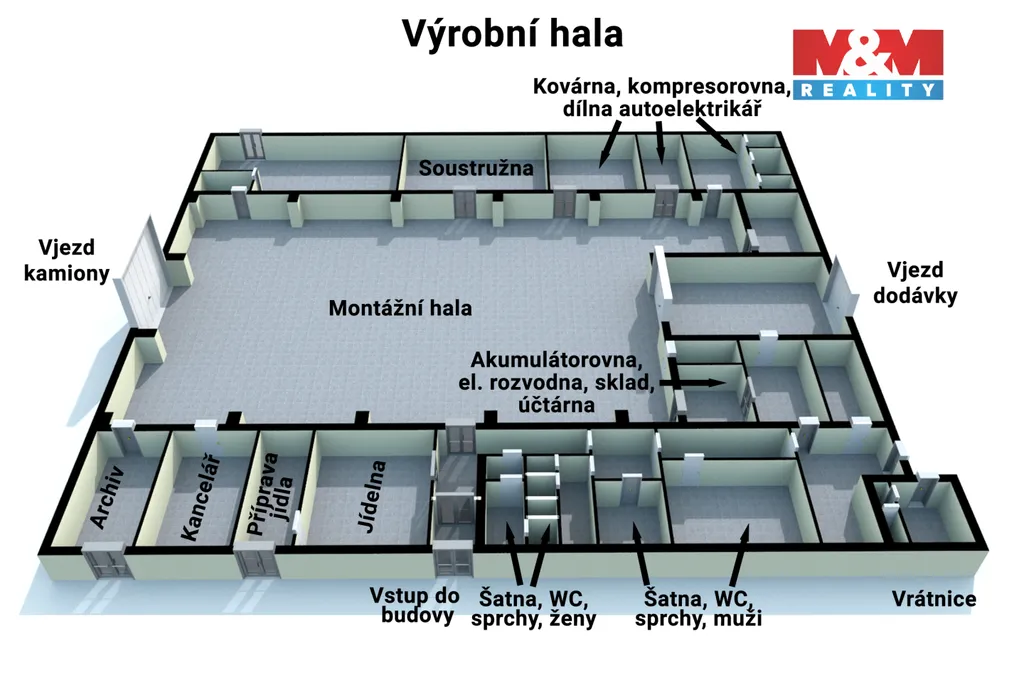 K pronájmu nabízíme výrobní halu o ploše 1.056 m² na okraji Uherského Brodu, přímo u silnice E50. Objekt je vhodný pro výrobu, skladování i jiné komerční využití. Disponuje dvěma vjezdy – východními vraty pro dodávky (výška 3,23 m) a západními vraty (výška 5 m), které umožňují pohodlný vjezd i kamionů. Uvnitř je instalován jeřáb s nosností 5 tun a podlaha s nosností 10 t/m², což splní i náročné provozní požadavky. Pro zaměstnance je připraveno zázemí s oddělenými šatnami, sprchami, WC, jídelnou s přípravnou a možností samostatných dílen či kanceláří. K hale náleží sedm parkovacích míst, další lze pronajmout dle potřeby. Objekt je napojen na obecní vodovod a kanalizaci s ČOV. V roce 2021 prošel rekonstrukcí – nové rozvody elektřiny, úsporné LED osvětlení, zateplená střecha, plastová okna a zateplená vrata. Moderní hala s výbornou dostupností je připravena k okamžitému využití. Pro více informací či sjednání prohlídky kontaktujte makléře.