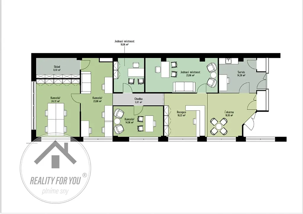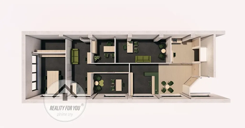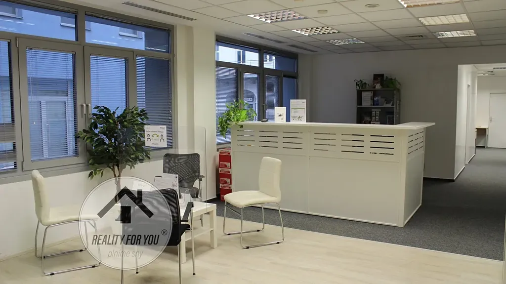 Prostor nabízí 3 samostatné kanceláře, 2 průchozí, kuchyňku, sklad, recepci a prostor pro klienty viz. půdorys, který je k dispozici ve fotogalerii.