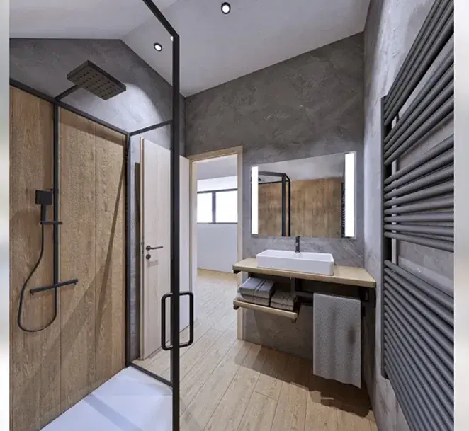 Koupelna a WC zabírají 3,43 m² a mají keramickou podlahu a obklad.