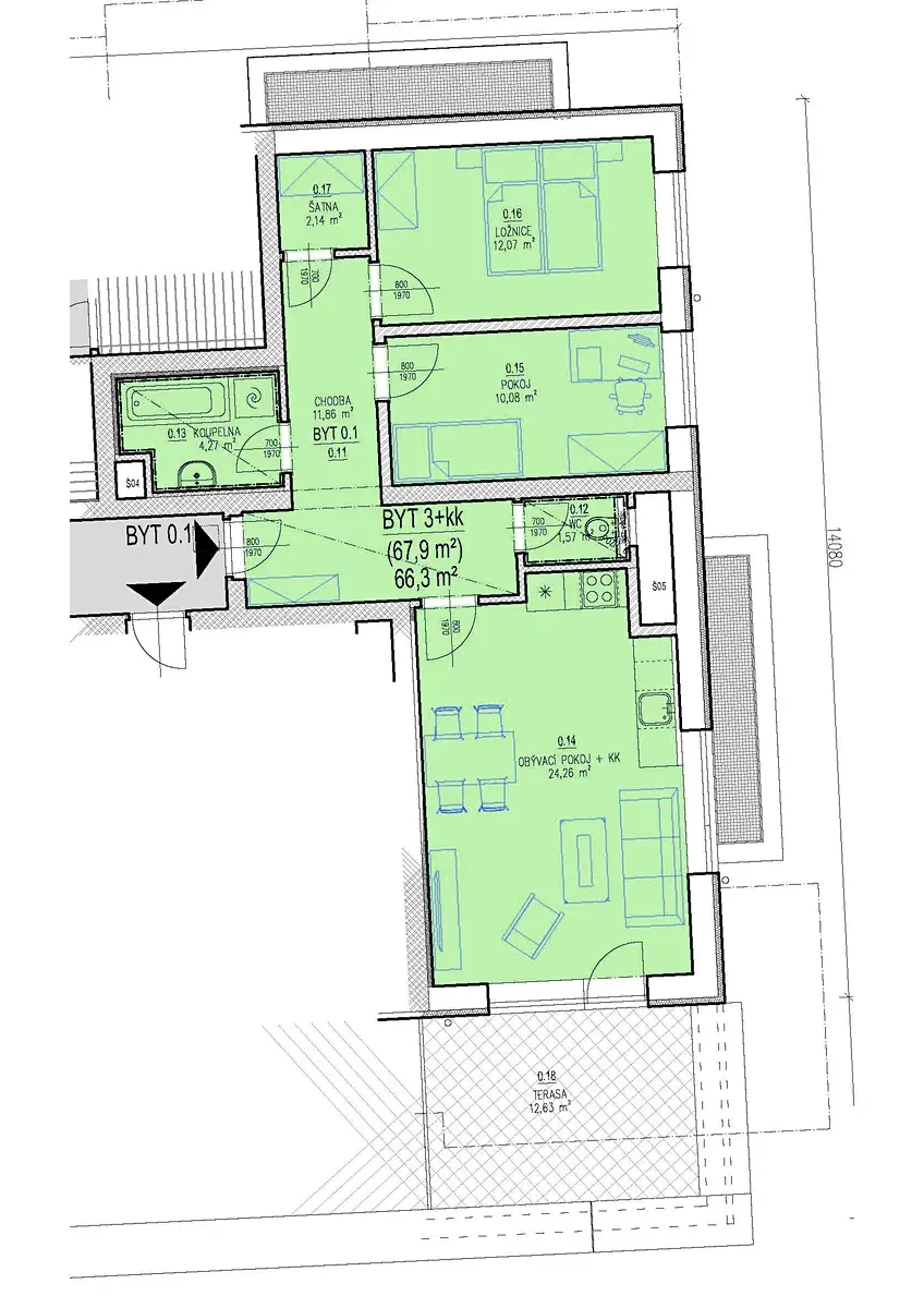- byt 0.7. o velikosti 66,50 m2 bez sklepa + terasa 16,90 m2 za cenu 8.030.000,- Kč v 1.PP domu CD22