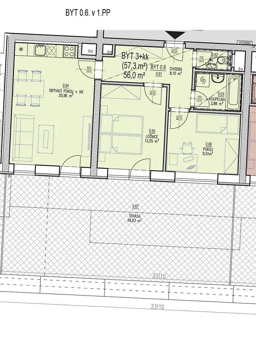 - byt 0.6. o velikosti 57,30 m2 bez sklepa + terasa 49,63 m2 za cenu 7.466.000,- Kč v 1.PP domu CD22