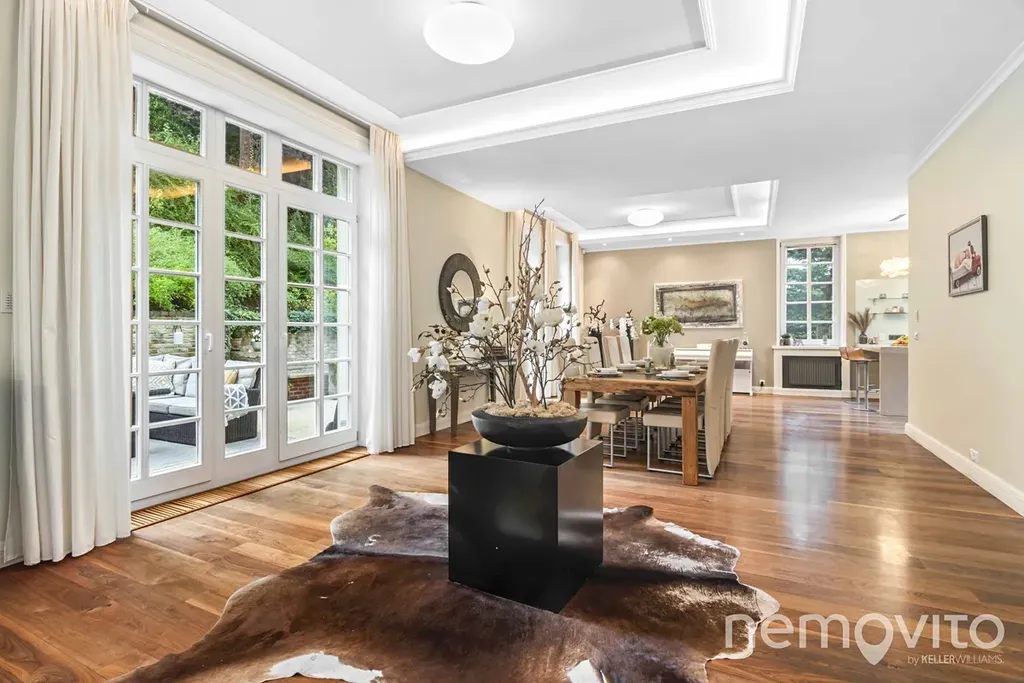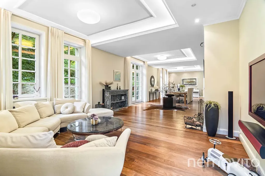 The dominant feature of the house is the living room, whose area is almost 100 sqm in total, with several French windows. These provide amazing views of the green garden, which is designed with maximum privacy. The living room has a fireplace and an entrance to the terrace. Thanks to the terrain difference, it is completely separated from the neighboring street. The space can easily accommodate up to twenty guests.