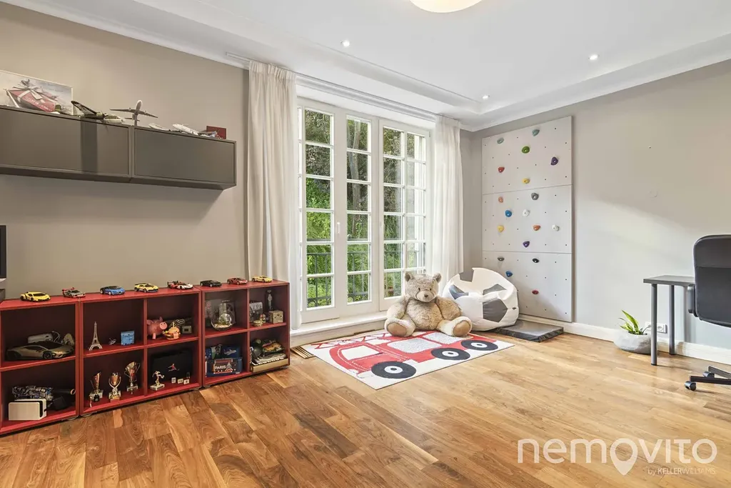 On the first floor there is also a quest room or an office (dressing room, bathroom). The hall is dominated by a beautiful wooden staircase. The master bedroom (24 sqm) with an en-suite bathroom and a free-standing bathtub also has a dressing room. The children's rooms (19 and 25 sqm) are connected by a bathroom and a large dressing room. Above the entire floor plan of the house there is a spacious attic. The current layout offers a 4-bedroom villa with 3 bathrooms.