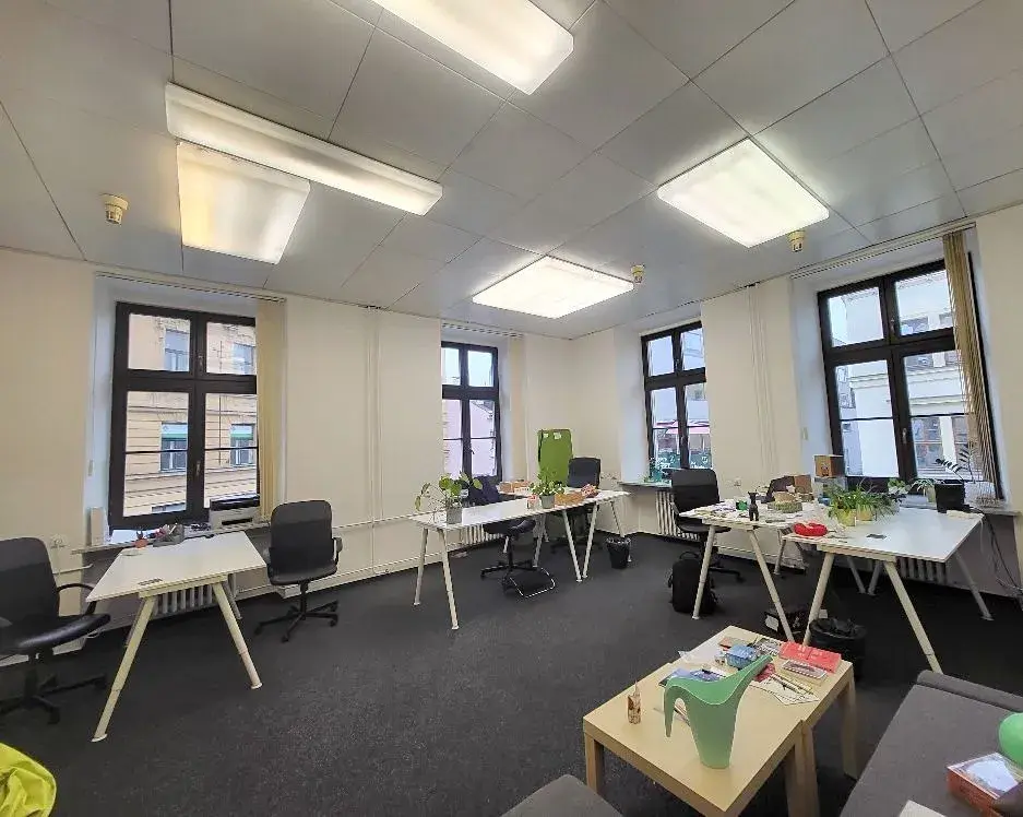 Prostor tvoří jedna velká kancelář, jedna menší kancelář a předsíňka s kuchyňskou linkou. Kancelář je vymalovaná na bílo, na podlaze je položen koberec. Vybavení kanceláře není součástí nájmu.