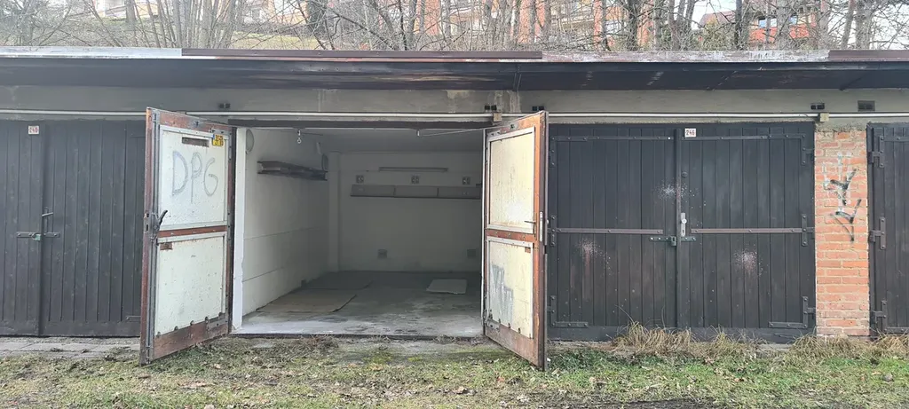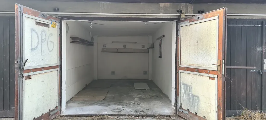 Garáž je v dobrém stavu a je vybavena elektrickou zásuvkou a osvětlením, což umožňuje i využití jako skladovací prostor.