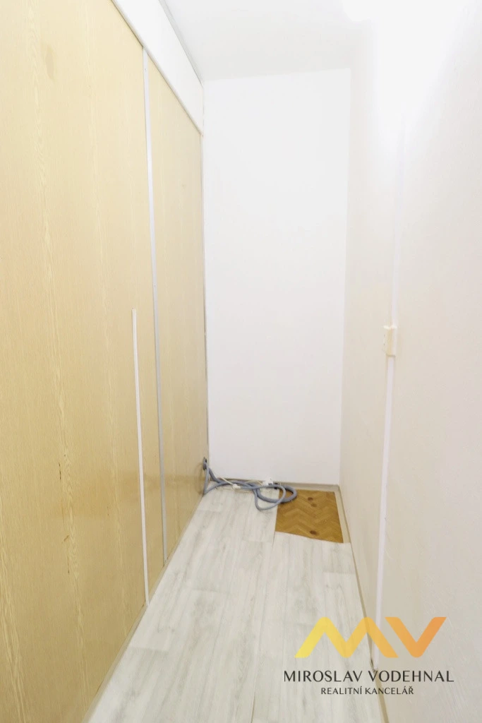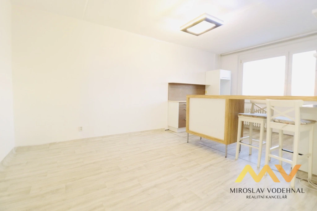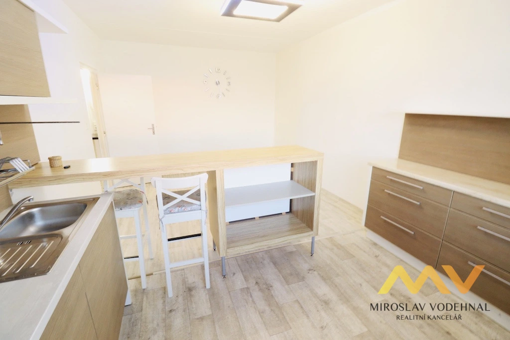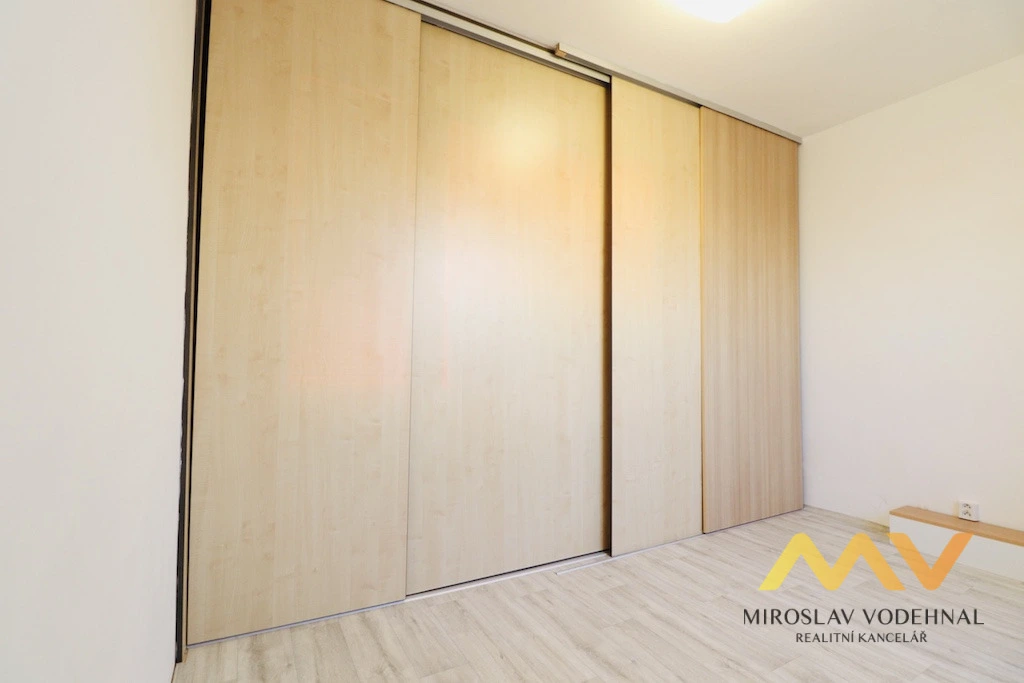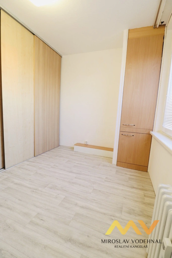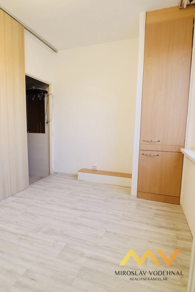 Jedná se o byt v osobním vlastnictví s důmyslnou změnou dispozice z původní 1+1 na 2+kk. Obývací pokoj je spojen s kuchyňským koutem a z původní kuchyně je nyní ložnice. Jádro umakartové, renovovaná koupelna s minivanou a WC. Kuchyňský kout s pultem je vybaven linkou s el. troubou a sklokeramickou varnou deskou. V ložnici a v předsíni vestavěné skříně. Za posuvnými dveřmi je praktická komora.
