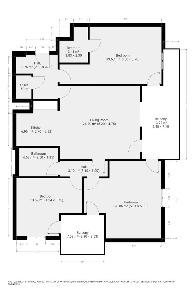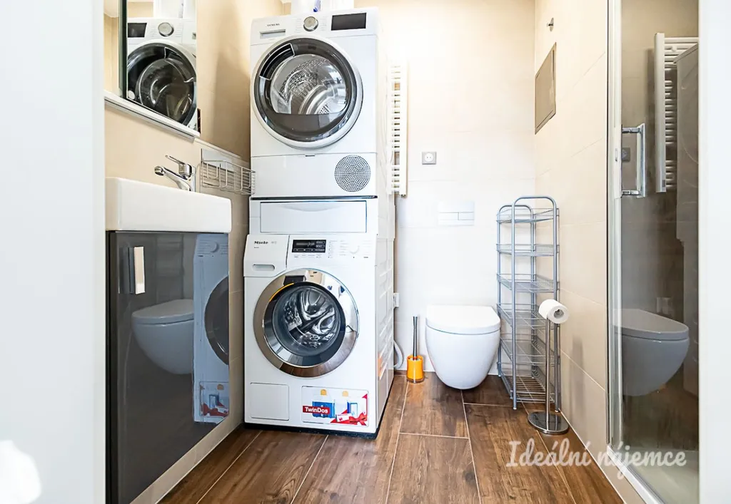 Interiér je nabízen jako nezařízený, což budoucím nájemníkům poskytuje ideální příležitost uzpůsobit si bydlení přesně podle vlastního vkusu a potřeb. Srdcem domova je velkorysý obývací pokoj s jídelním koutem, který je již vybaven sedací soupravou a konferenčním stolem. Na něj navazuje moderní kuchyňská linka se všemi spotřebiči včetně lednice s mrazákem, elektrické a mikrovlnné trouby, varné desky, digestoře a myčky. Dispozici doplňují další tři samostatné neprůchozí pokoje, které mohou sloužit jako ložnice, dětské pokoje nebo pracovna. Velkou výhodou jsou dvě koupelny – první je vybavena vanou, umyvadlem a toaletou, zatímco druhá disponuje sprchovým koutem, druhou toaletou a je v ní umístěna pračka i sušička. V předsíni je toaleta pro hosty.