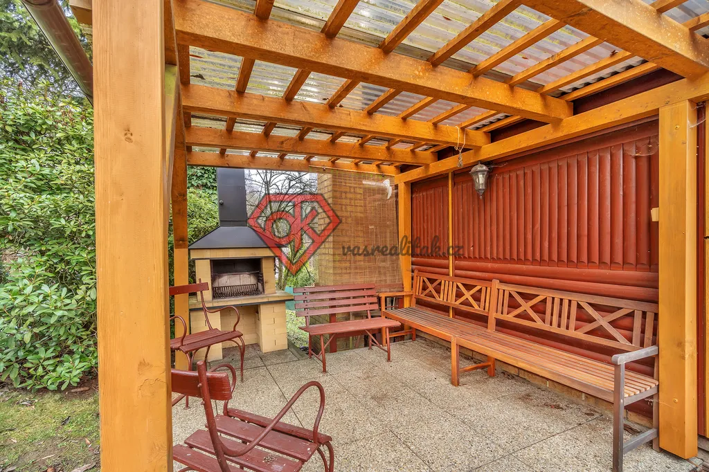 - zahrada s ovocnými stromy, pergola s posezením a grilem, starý osvěžovací bazének