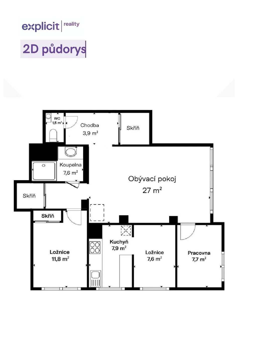 Dispozice nabízí samostatnou kuchyni, tři neprůchozí pokoje a prostorný obývací pokoj s jídelní částí, který tvoří přirozené centrum bytu. Koupelna se sprchovým koutem a samostatná toaleta zvyšují každodenní komfort, ať už byt využívá rodina nebo více osob.