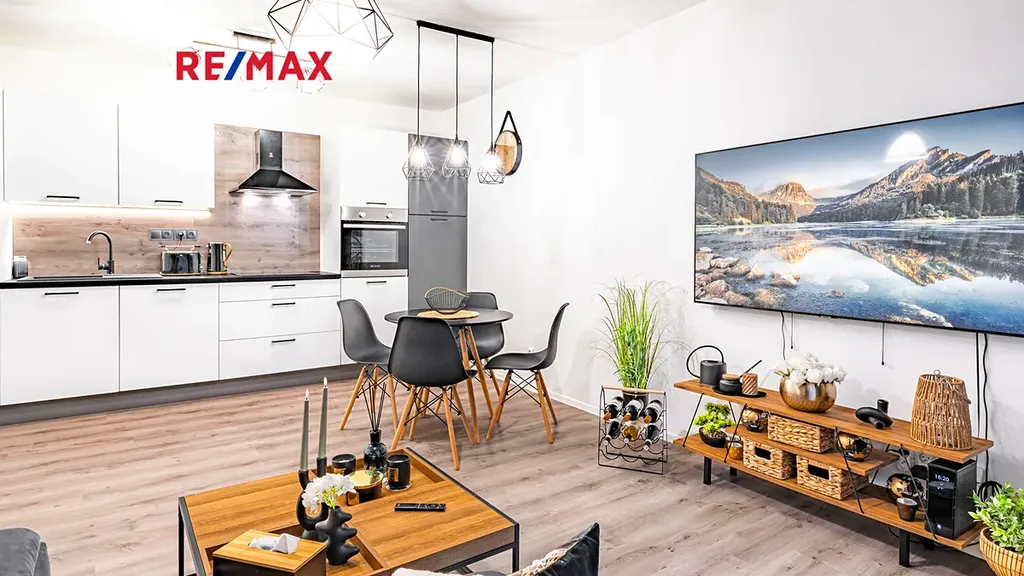 Byt je připraven k okamžitému nastěhování. Součástí vybavení bytu je 65" Smart TV SAMSUNG QE65Q80A, set pračky se sušičkou, tyčový vysavač, moderní úsporná svítidla, interiérové dekorace atd. Kuchyňská linka je v bílém provedení s černými úchytnými lištami, vybavená spotřebiči - pečící el. trouba, indukční varná deska, mikrovlnná trouba, lednice, myčka nádobí, digestoř.