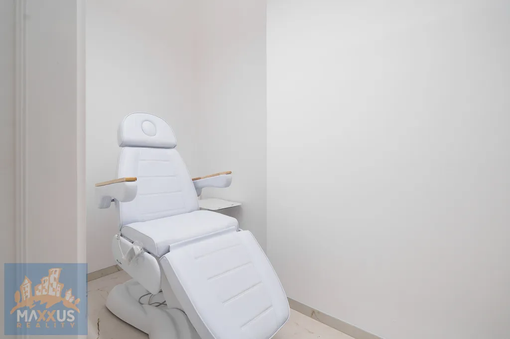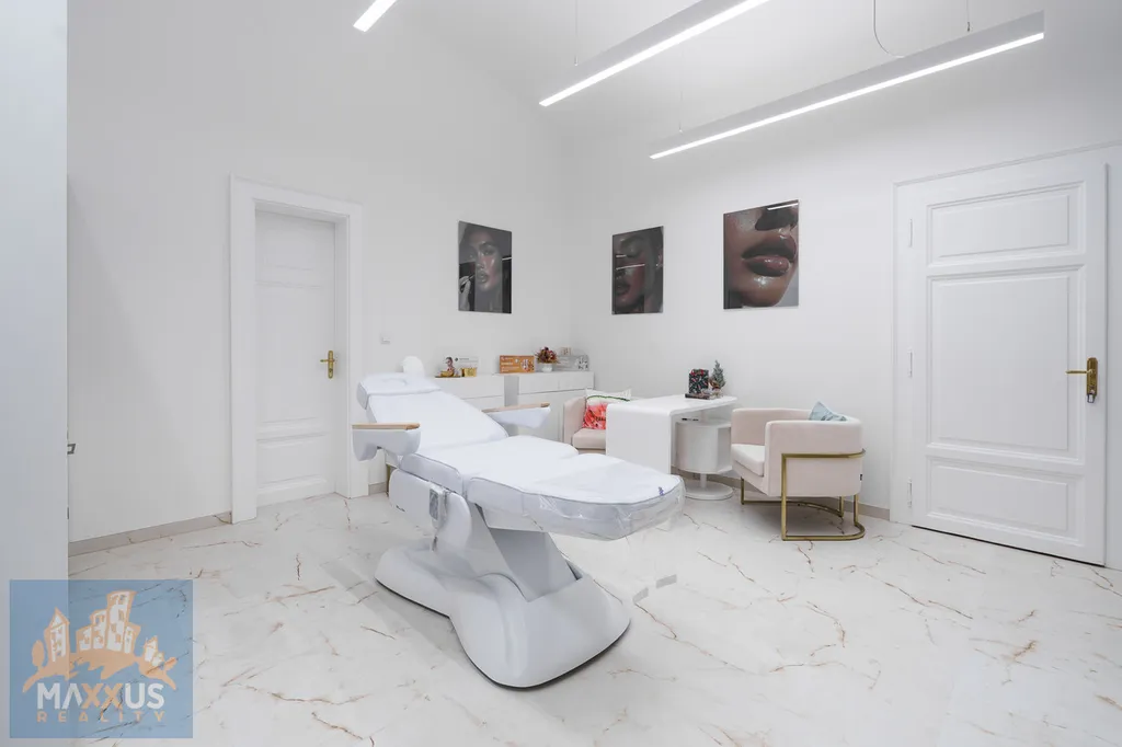 Dispozice a vybavení: hlavní místnost 25 m², menší místnost 10 m², v každé místnosti elektrické lehátko, kompletní zařízení, aktuálně uzpůsobeno pro kosmetiku.