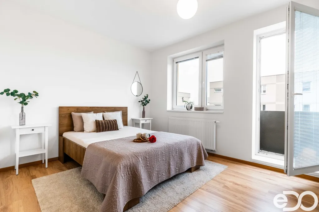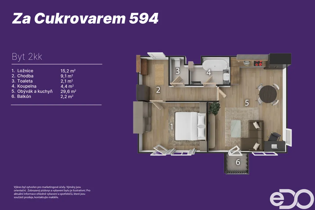 Byt se nachází ve 3. nadzemním podlaží a má podlahovou plochu 62,8 m². Dispozice zahrnuje obývací prostor s kuchyní a přímým vstupem na balkon o velikosti 1,6 m². Otevřený a vzdušný charakter obývacího pokoje s kuchyňským koutem umožňuje kromě obývací sestavy pohodlně umístit i pracovní kout nebo knihovnu. Kuchyňská linka je vyhotovena na míru v černo-dřevěném dekoru a osazena spotřebiči Bosch. K bytu dále náleží sklepní kóje o velikosti 2,2 m². Vybavení bytu může zůstat dle dohody.