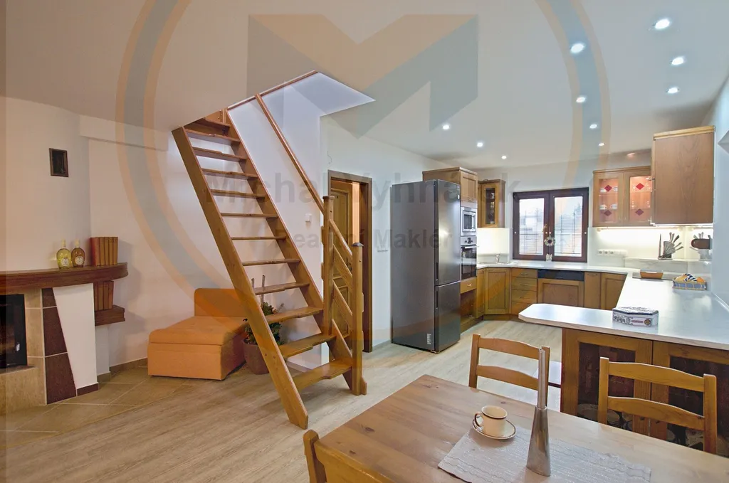 Dominantou domu je prostorný obytný prostor s kuchyňským koutem o výměře 50,45 m², propojený s terasou. Součástí kuchyně je samostatná místnost využívaná jako spíž.