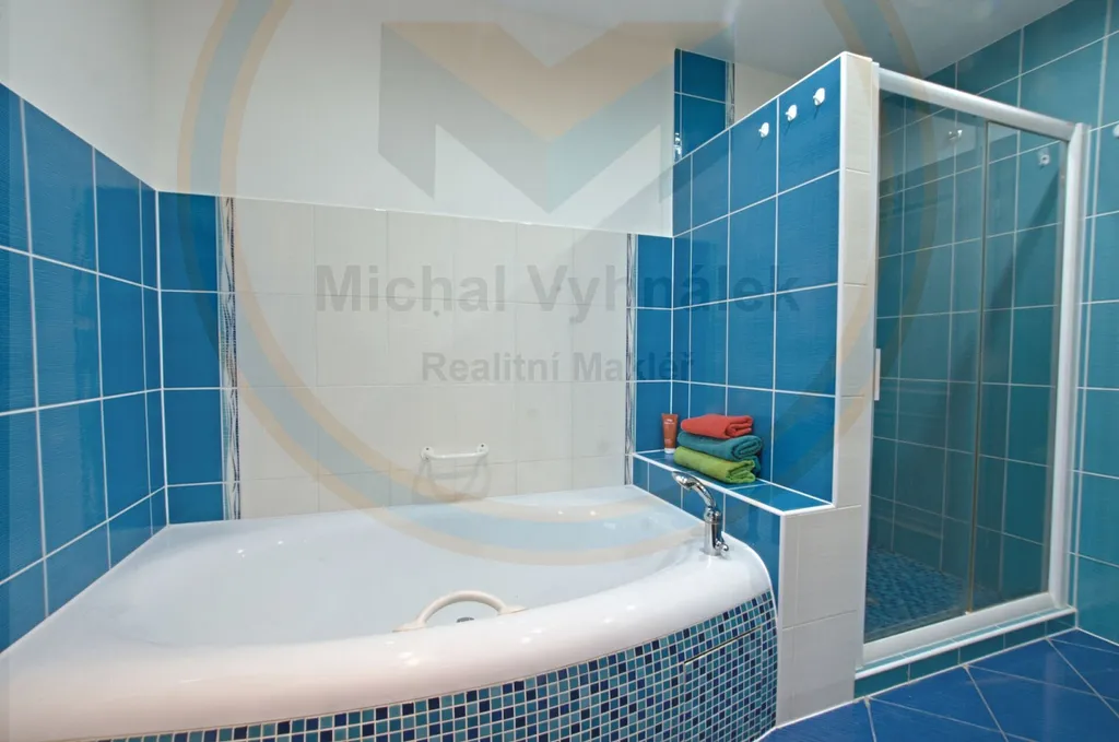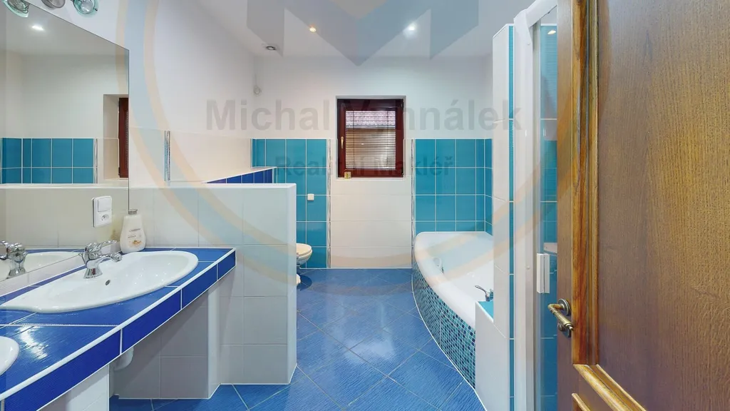 Další výraznou předností domu je koupelna o výměře 9,05 m², která nabízí vanou, sprchový kout, bidet, WC a dvojité umyvadlo, vše sladěné v jednotném obkladu.