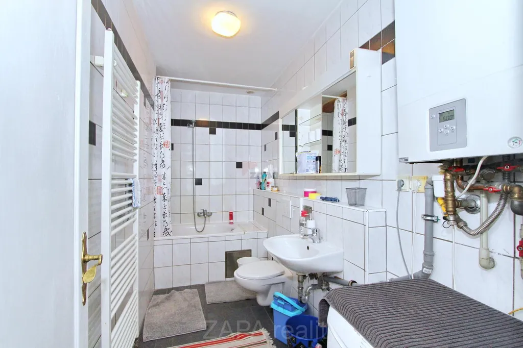V koupelně je vana, topení a ohřev vody zajišťuje plynový kotel.
